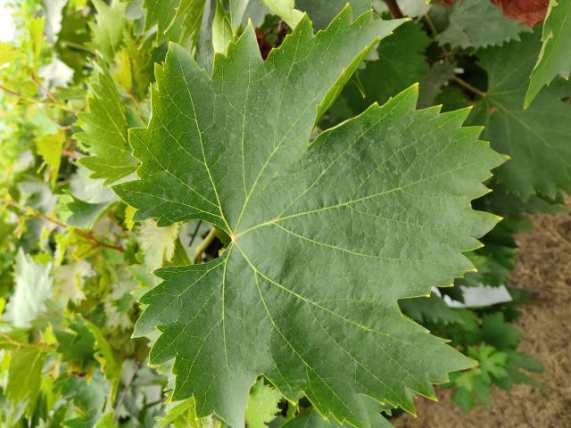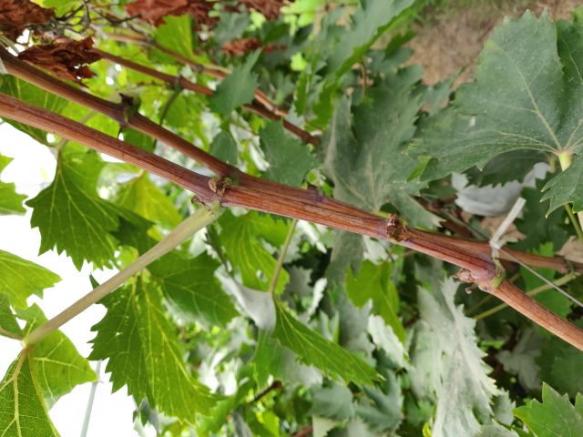 新稍梢尖颜色为黄绿色带紫红,幼叶颜色为浅紫红色,成熟枝条颜色为暗红色,成龄叶形状为五角形,裂片数为5裂,花器类型为两性花,果穗基本形状为圆锥形,双岐肩,有副穗。
