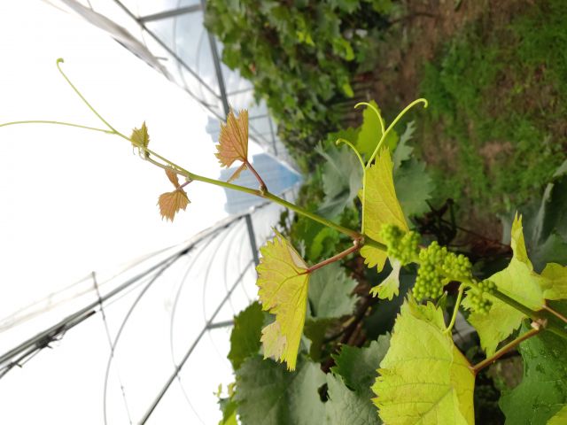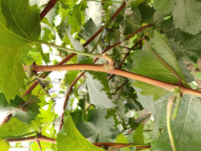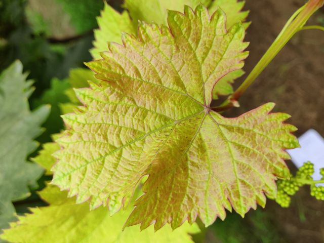 新稍稍尖颜色为绿色, 幼叶颜色为绿色,成熟枝条颜色为浅褐色, 成龄叶形状 为心形,裂片数为3裂,花器类型为雌性花,果穗形状为圆筒状,有副穗。