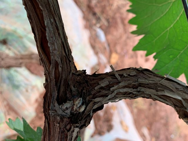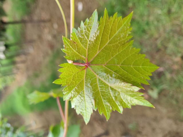 新梢梢尖颜色为黄绿略带紫红,幼叶颜色为黄绿色,成熟枝条颜色为红褐色,成龄叶形状为五角形,裂片数为5裂,花器为两性花,果穗基本形状为圆锥形,有歧肩,无副穗。