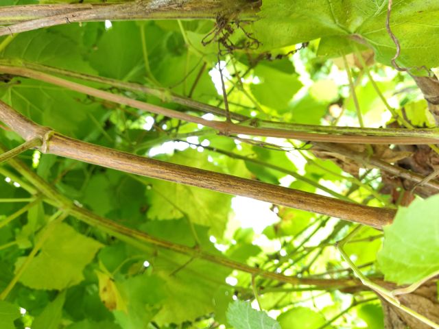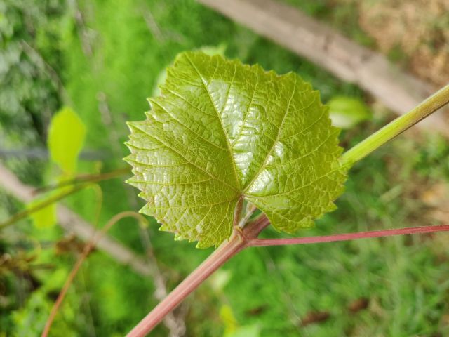 新梢梢尖颜色浅紫红色,稍尖有绒毛,白色,边缘玫瑰红。幼叶黄铜色,成龄叶形状为楔形,枝蔓红褐色至赭色,雄性花,植株生长势旺盛,不定根形成能力强。