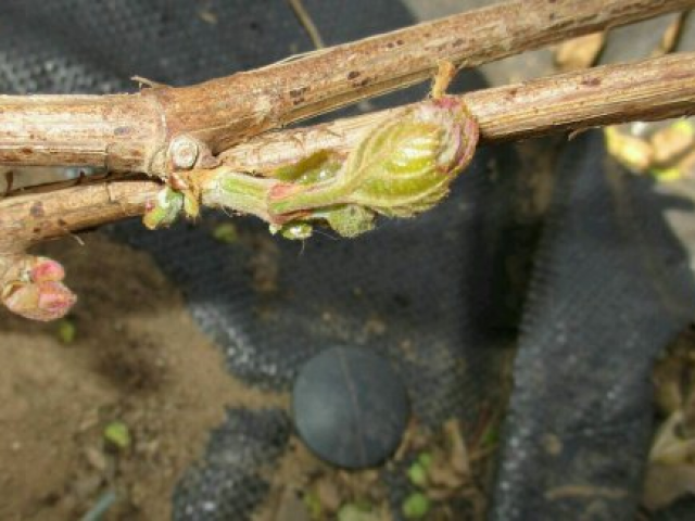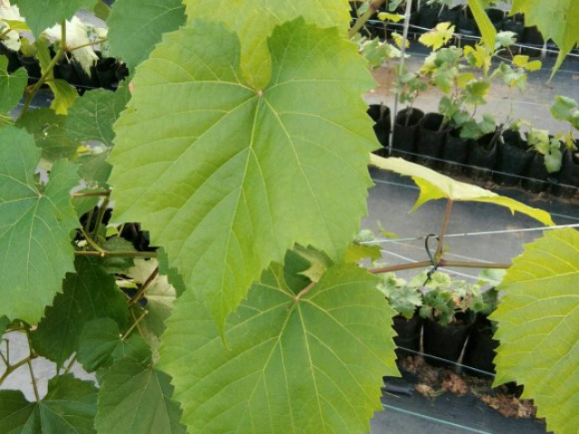 稍尖有绒毛、白色边缘玫瑰红,幼叶网纹、绿色或黄铜色,成龄叶形状为楔形,微黄,枝蔓深赭褐色,花为生理雄性,生长势旺盛。
