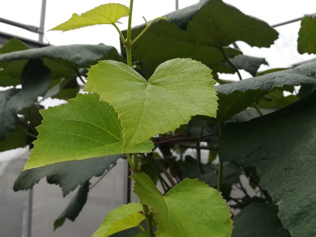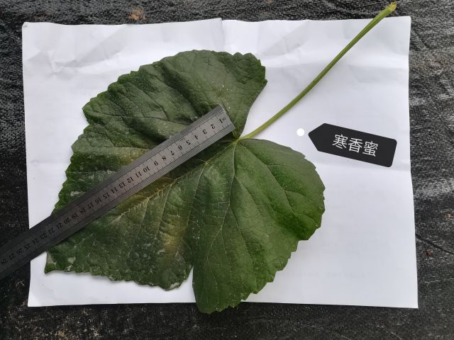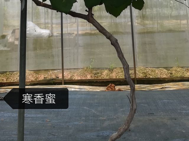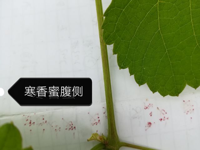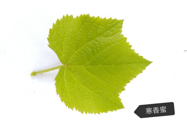 新稍梢尖颜色为白绿色,幼叶颜色为粉红色,成熟枝条颜色为红褐色,成龄叶形状为近圆形,无刻裂,花器类型为两性花,果穗基本形状为圆锥形,无岐肩,有副穗。