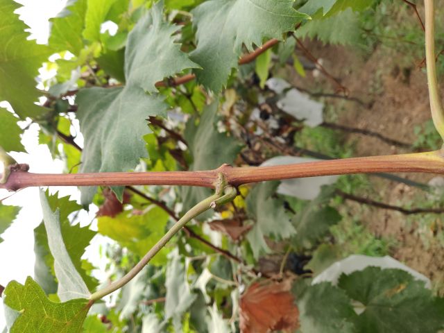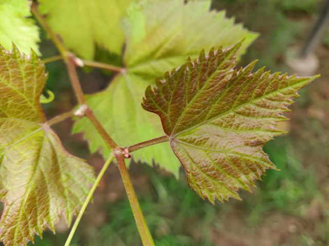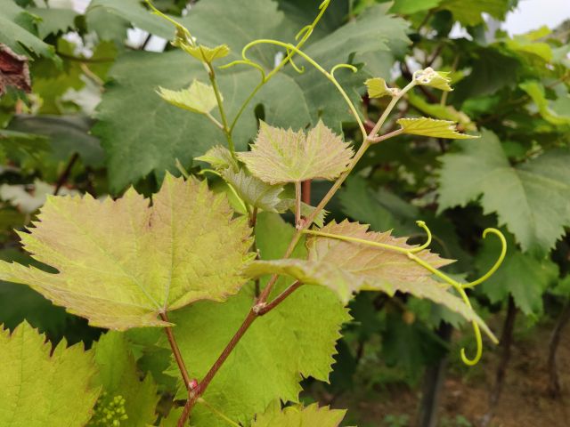 新稍梢尖颜色为绿色,幼叶颜色为白色带紫色,成熟枝条颜色为暗褐色,成龄叶形状为心形,裂片数为3或5裂,花器类型为两性花,果穗基本形状为圆锥形,有岐肩,无副穗。
