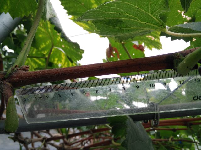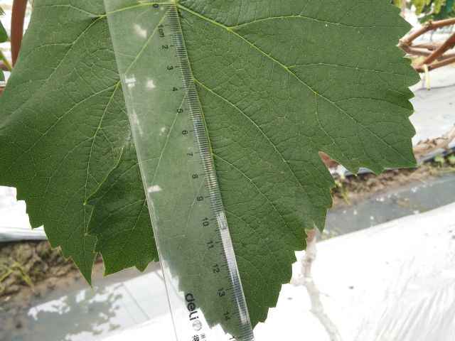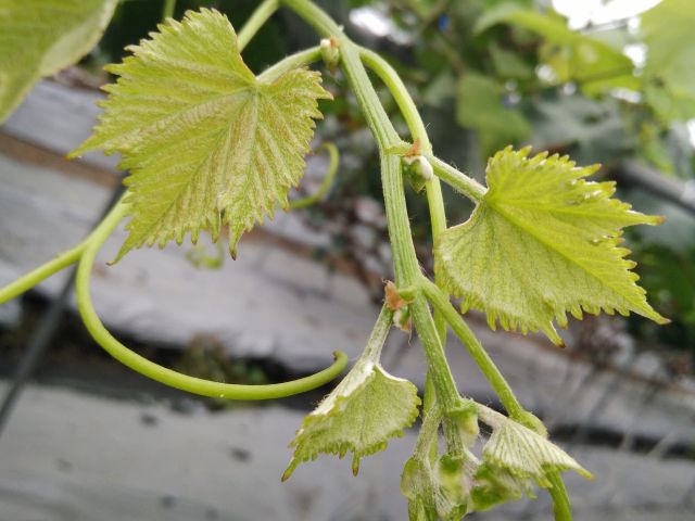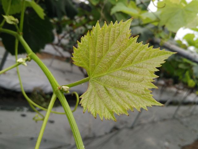 新稍梢尖颜色为浅绿色,幼叶颜色为浅绿色,成熟枝条颜色为红褐色,成龄叶形状为近圆形,裂片数为3~5裂,花器类型为两性花,果穗基本形状为圆锥形,无岐肩,无副穗。
