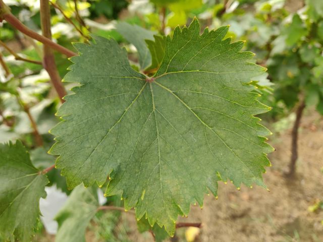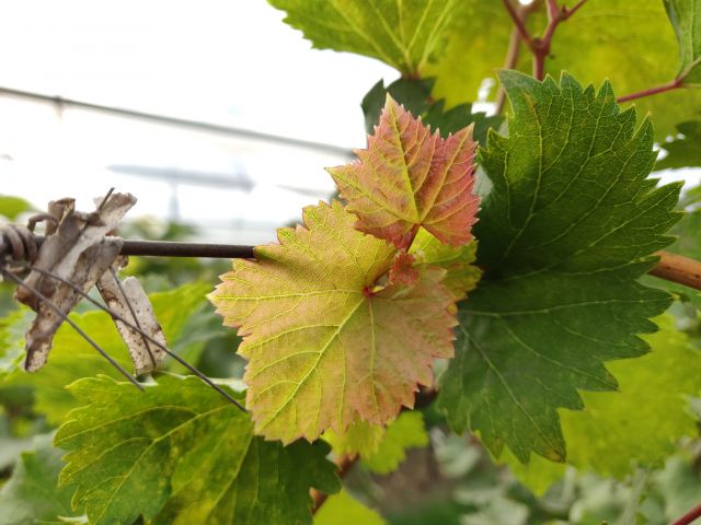 新稍梢尖颜色为黄绿色带紫红色,幼叶颜色为紫红色,成熟枝条颜色为红褐色,成龄叶形状为心形,裂片数为5裂,花器类型为两性花,果穗基本形状为圆锥形,无岐肩,无副穗。