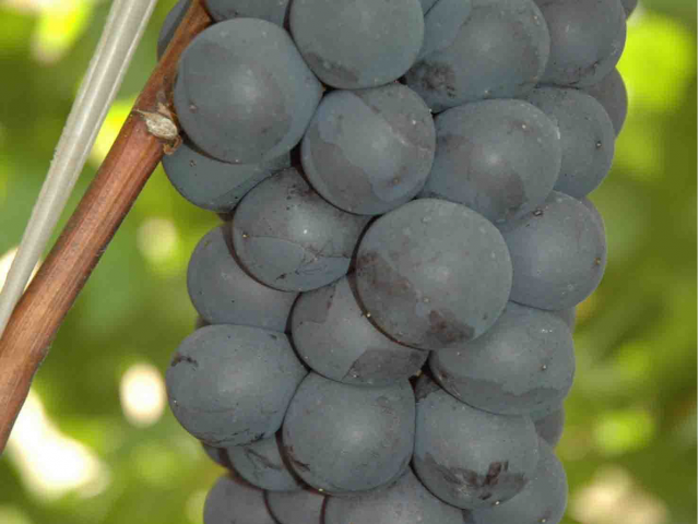 新稍梢尖颜色为紫红色带黄绿色,幼叶颜色为白绿色带紫色,成熟枝条颜色为红褐色,成龄叶形状为近圆形,裂片数为3裂或全缘,花器类型为两性花,果穗基本形状为圆锥形,无岐肩,无副穗。