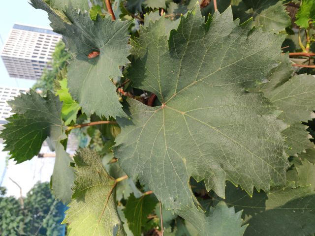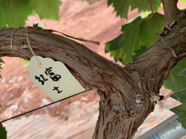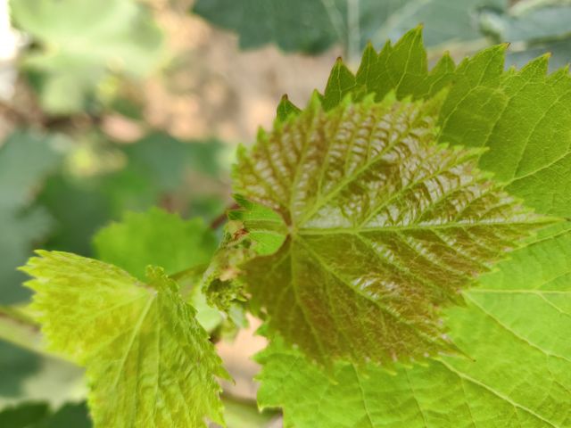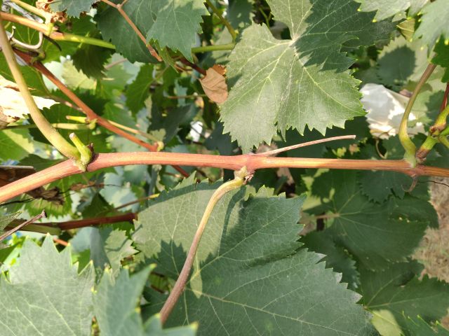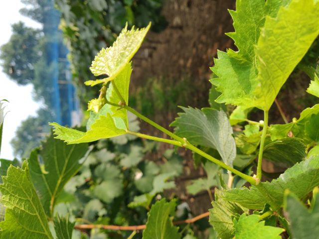 新稍梢尖颜色为绿色,幼叶颜色为绿色稍带粉红色,成熟枝条颜色为浅褐色,成龄叶形状为近圆形,裂片数为3裂或5裂,花器类型为两性花,果穗基本形状为圆锥形,有岐肩,有副穗。