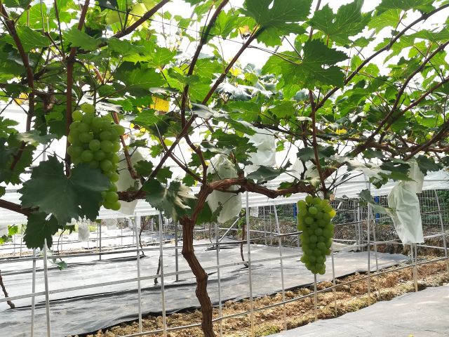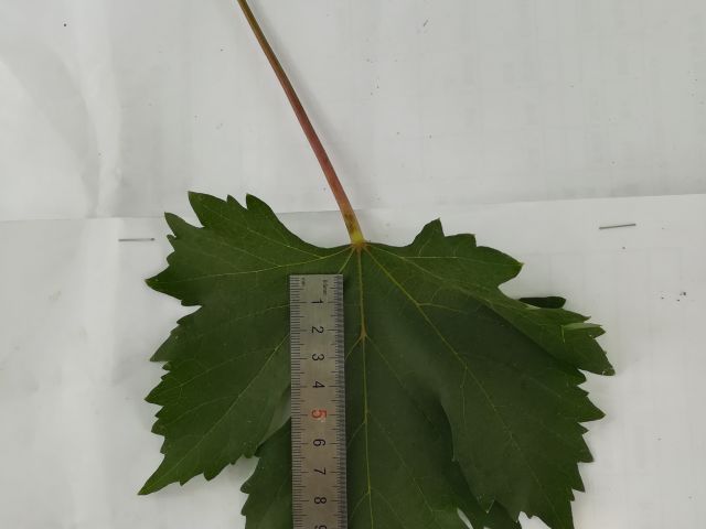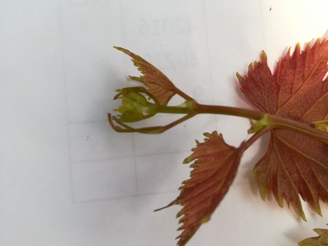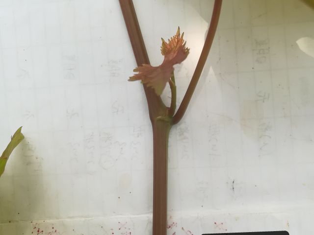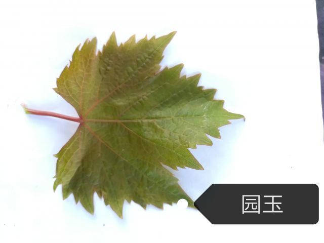 新稍梢尖颜色为红棕色,幼叶颜色为黄绿色,成熟枝条颜色为红褐色,成龄叶形状为楔形,裂片数为5裂,花器类型为两性花,果穗基本形状为圆锥形,有岐肩,有副穗。