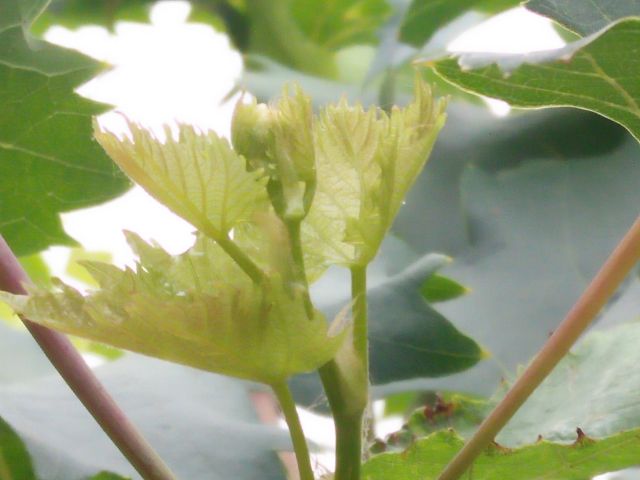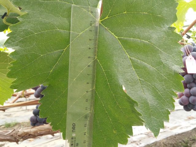 新稍梢尖颜色为绿色带紫红色,幼叶颜色为红绿色,成熟枝条颜色为红褐色,成龄叶形状为近圆形,裂片数为3裂或5裂,花器类型为两性花,果穗基本形状为圆锥形,无岐肩,有副穗。