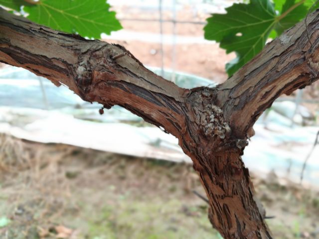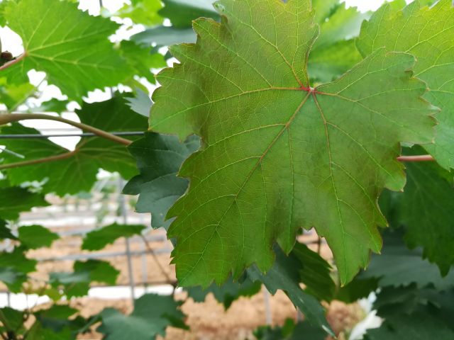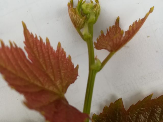 新稍梢尖颜色为黄绿色,幼叶颜色为紫红色带黄绿色,成熟枝条颜色为黄褐色,成龄叶形状为心形,裂片数为5裂,花器类型为两性花,果穗基本形状为圆锥形,无岐肩,无副穗。