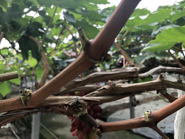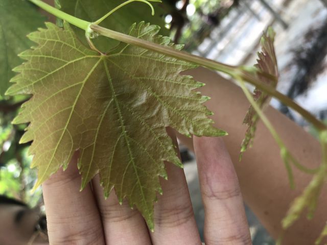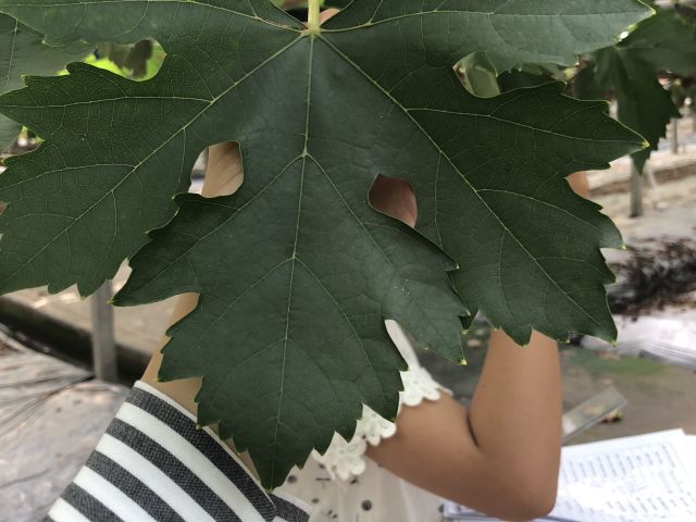 新稍梢尖颜色为紫红色带绿色,幼叶颜色为紫红色,成熟枝条颜色为红褐色,成龄叶形状为近圆形,裂片数为3~5裂,花器类型为两性花,果穗基本形状为圆锥形,无岐肩,无副穗。