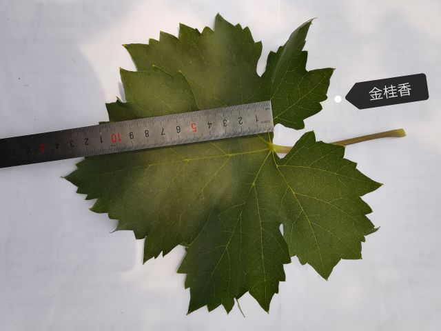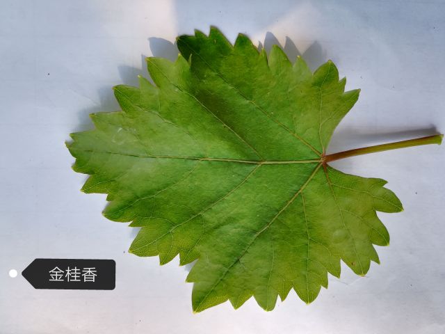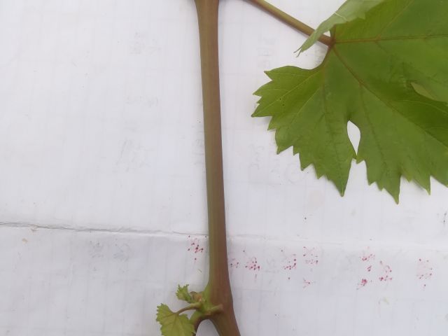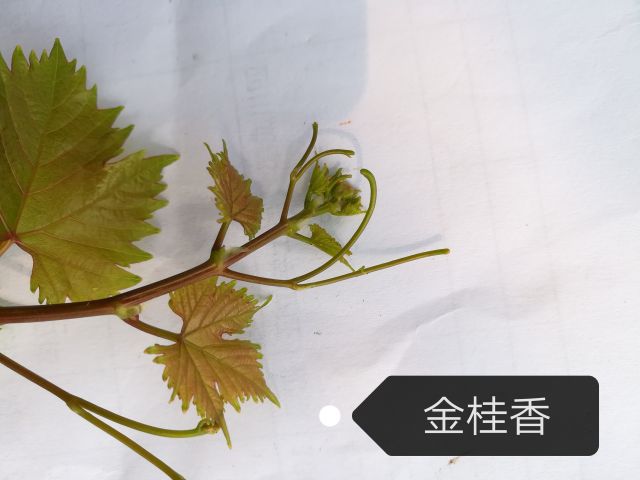 新稍梢尖颜色为黄绿色,幼叶颜色为黄褐色,成熟枝条颜色为黄褐色,成龄叶形状为心形,裂片数为5裂,花器类型为两性花,果穗基本形状为圆锥形,无岐肩,有副穗。