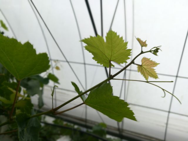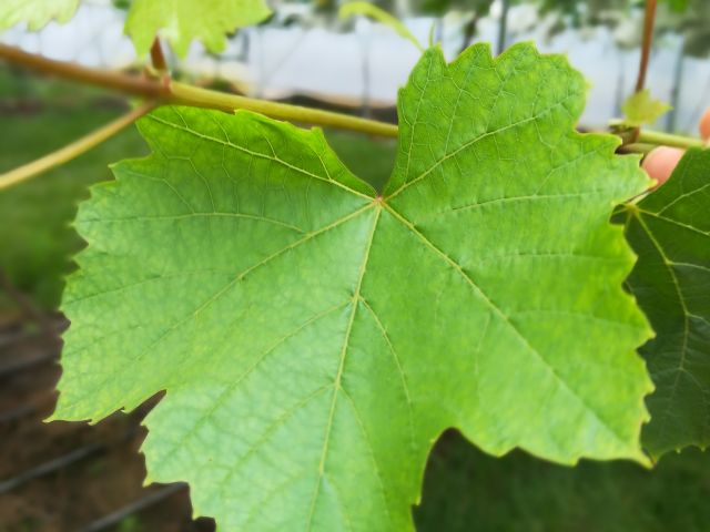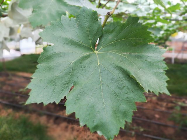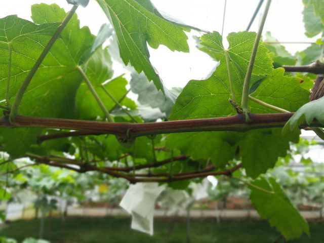 新稍梢尖颜色为绿色,幼叶颜色为深褐色,成熟枝条颜色为黄褐色,成龄叶形状为心形,裂片数为3~5裂,花器类型为两性花,果穗基本形状为圆锥形,有岐肩,无副穗。